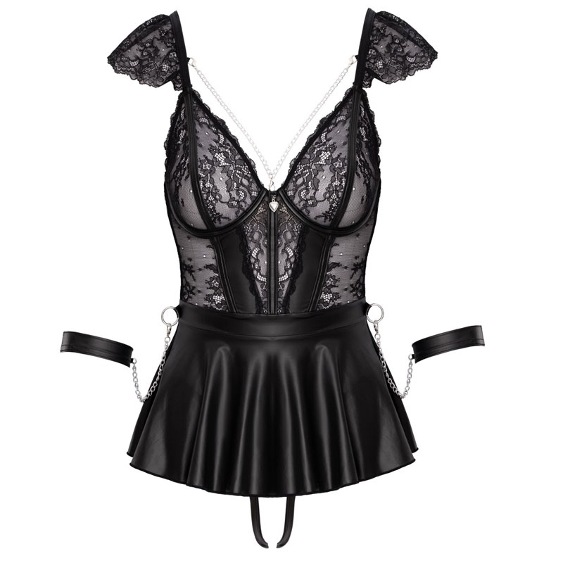 Die zarten Spitzen-Bügelcups werden von abnehmbaren Ketten mit Herzanhänger geschmückt, während feine Spitzenvolants an den verstellbaren Trägern sanft die Schultern umspielen. Das Mattlook-Röckchen schwingt verführerisch um Deine Hüfte und trägt seitlich kleine Ringe, an denen die beiliegenden Fesselriemen mit Karabinerketten eingehakt werden können – für prickelnde Momente ganz nach Lust und Laune.