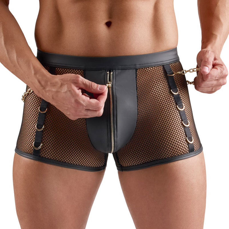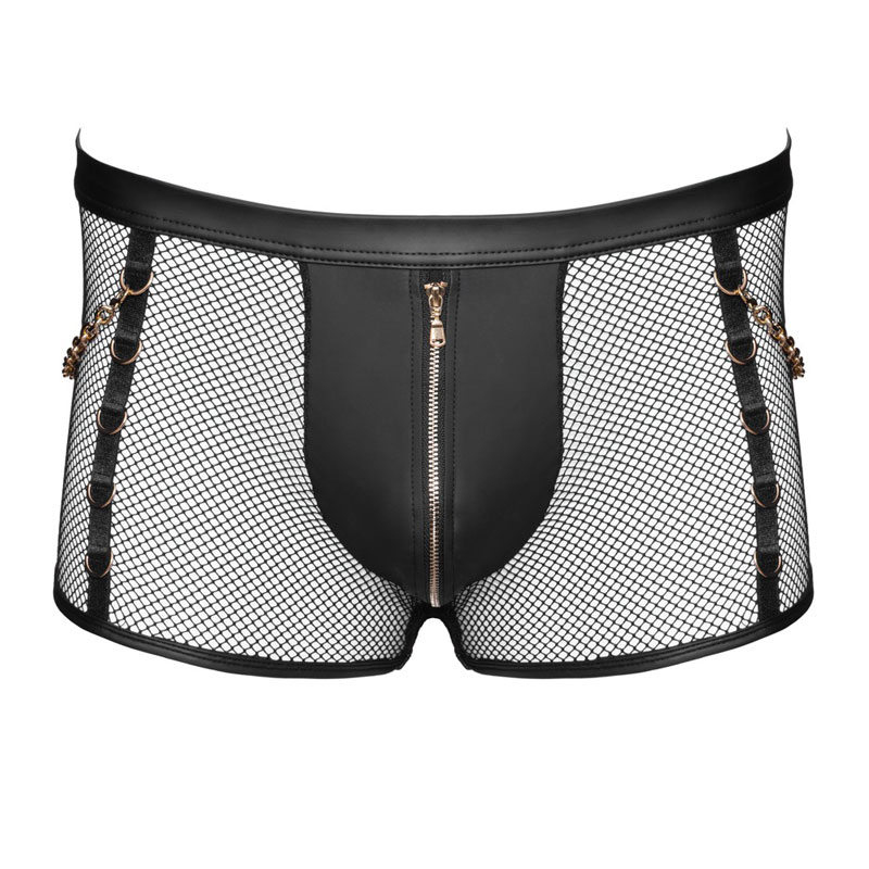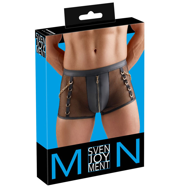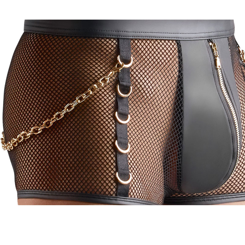 Diese schwarzen Pants von Svenjoyment sind ein echter Blickfang: Verführerisches Netz trifft auf glänzenden Wetlook – ein Mix, der Lust auf mehr macht. Der Reißverschluss im blickdichten Beutel setzt ein aufregendes Highlight, während der weiche, elastische Stoff sich sanft an Deinen Körper schmiegt und ein traumhaftes Tragegefühl schenkt. Goldfarbene Ringe an den Seiten und am Bund verleihen den Netz-Pants mit Ketten einen edlen Touch, und die beiden goldfarbenen Karabinerketten lassen sich nach Lust und Laune abnehmen – perfekt, um Dein Outfit nach Stimmung und Fantasie zu gestalten.