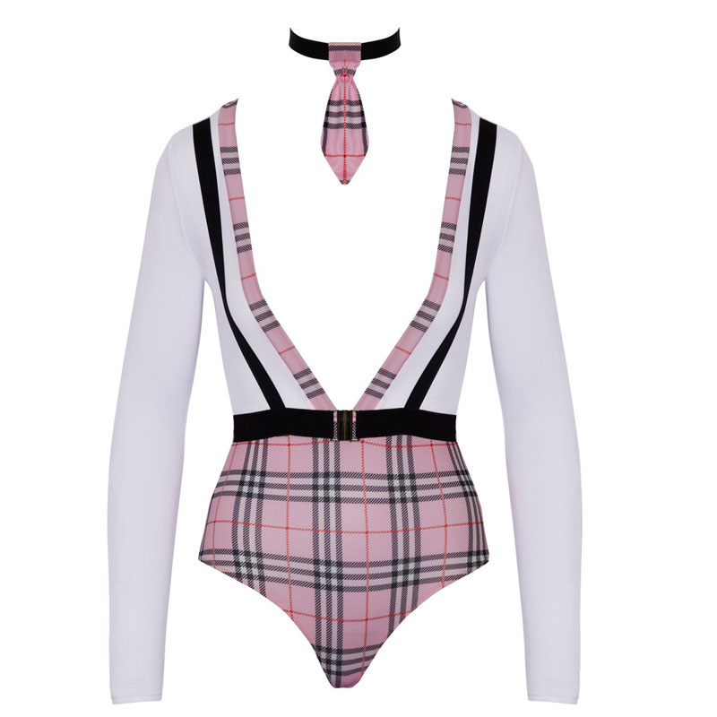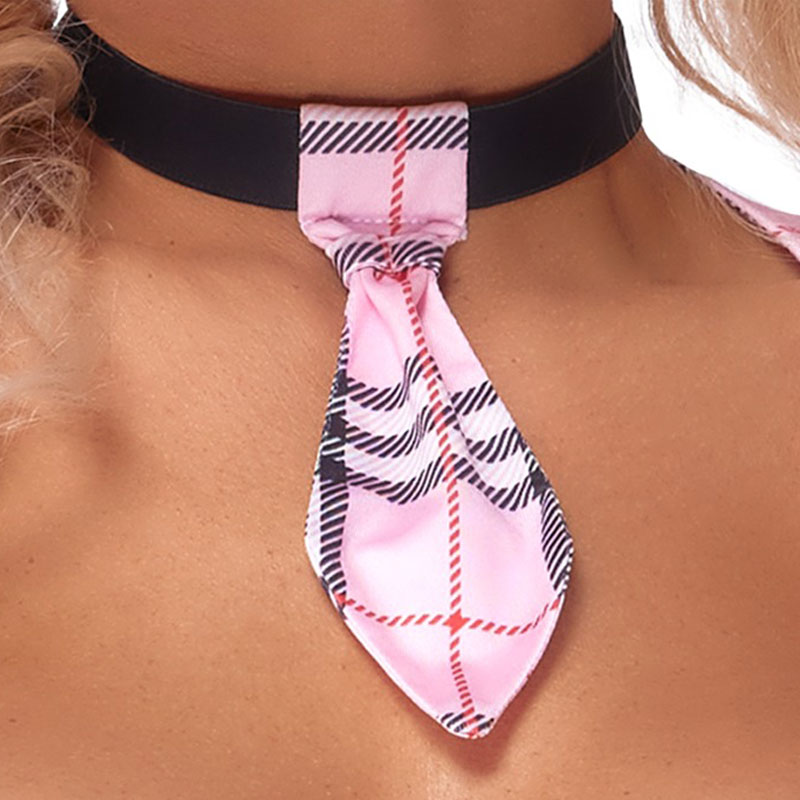 Das Krawatten-Halsband mit kleiner Karokrawatte und Schließe im Nacken setzt das i-Tüpfelchen auf dieses sündig-süße Outfit – perfekt für Rollenspiele, Mottoabende oder heiße Kostümpartys.
